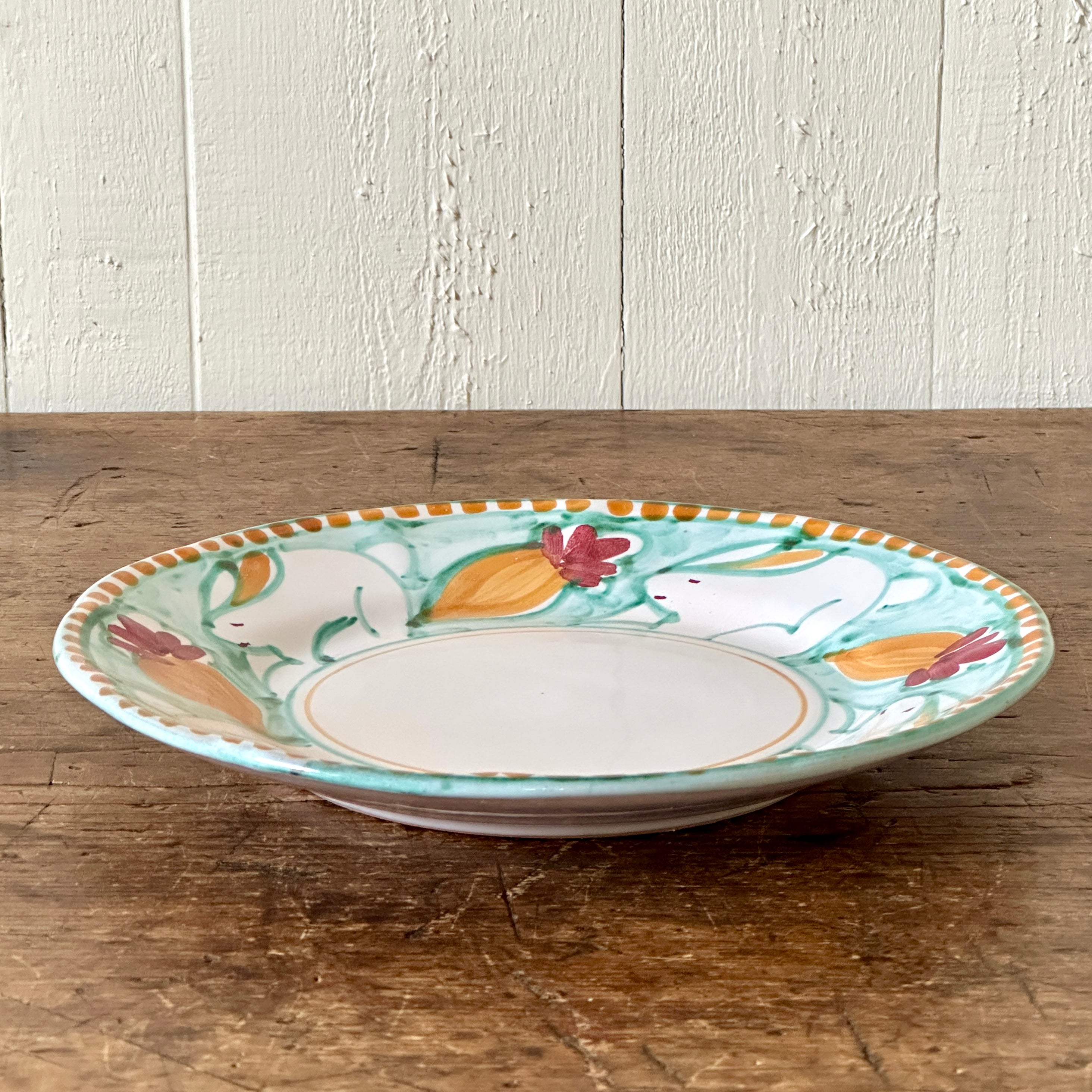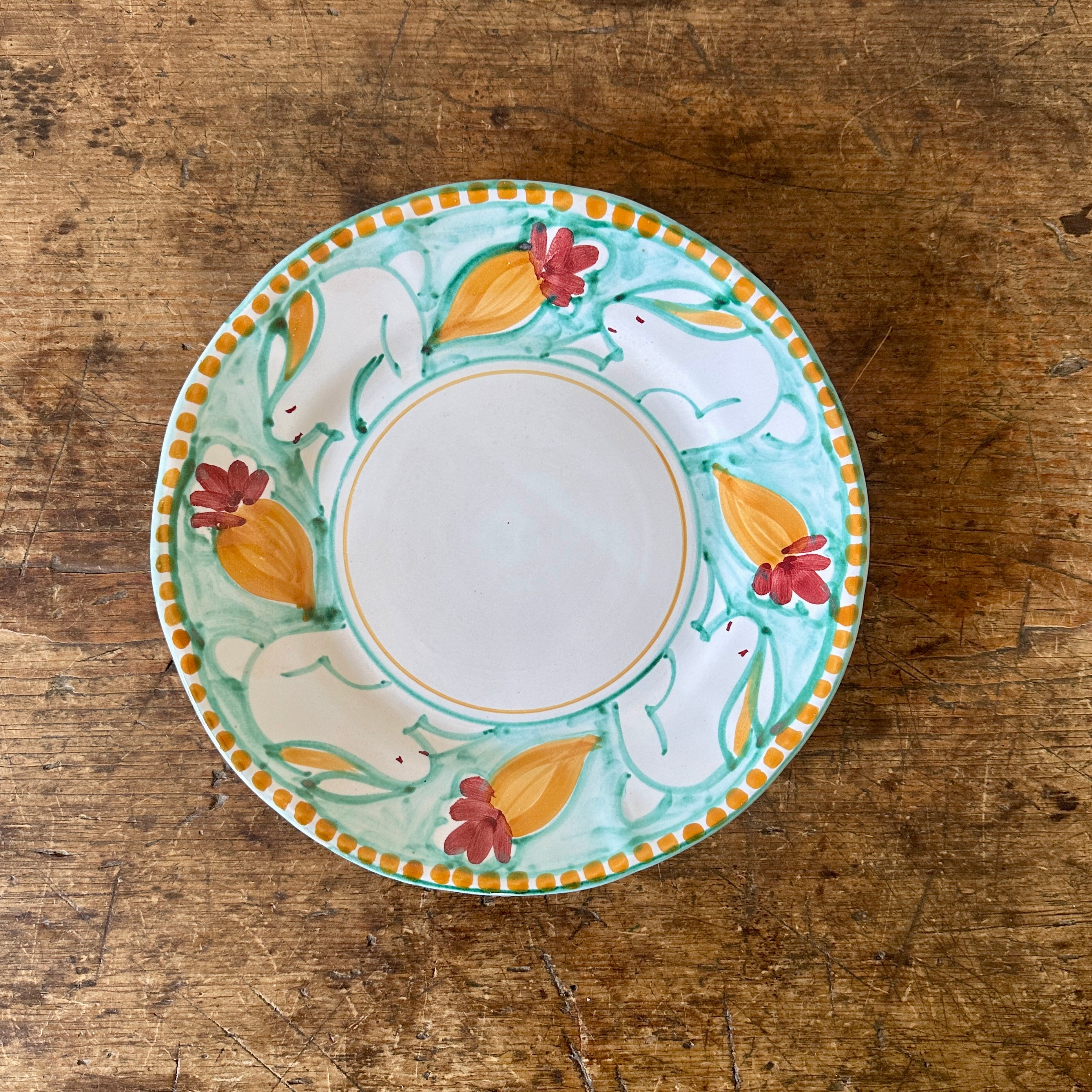 This colorful sky blue and tangerine Coniglio dinner plate features hand-painted rabbits and carrots. Mix and match with other Campagna patterns or with your existing tableware; the combinations are endless!