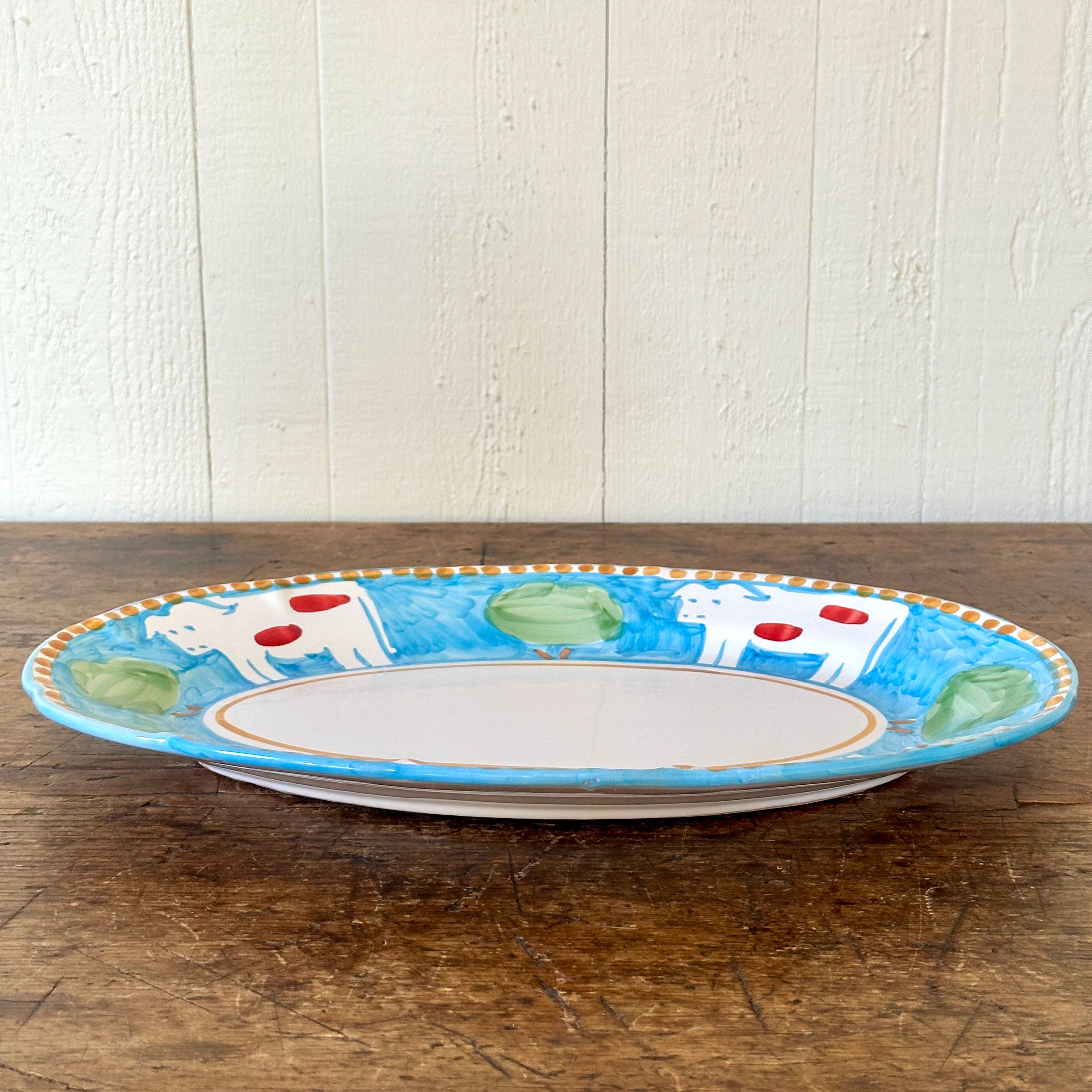 This vibrant blue and green Mucca oval platter features hand-painted cows.  Mix and match with other Campagna patterns or with your existing tableware; the combinations are endless!