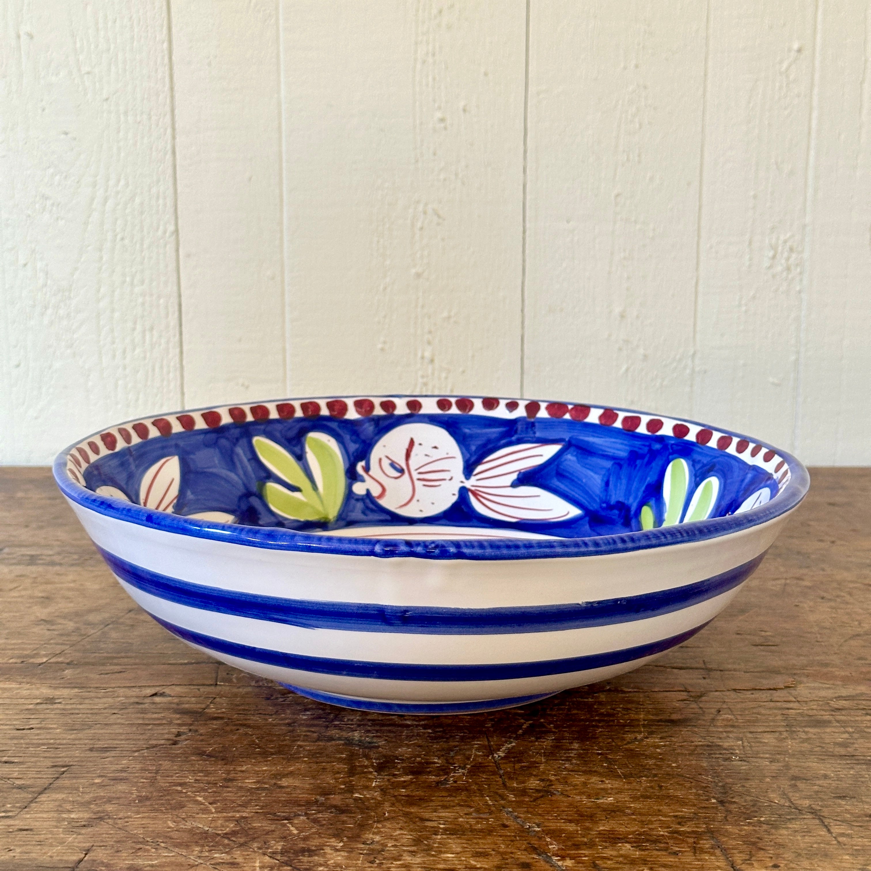 This colorful blue and red Pesce large serving bowl features hand-painted fish. Mix and match with other Campagna patterns or with your existing tableware; the combinations are endless!