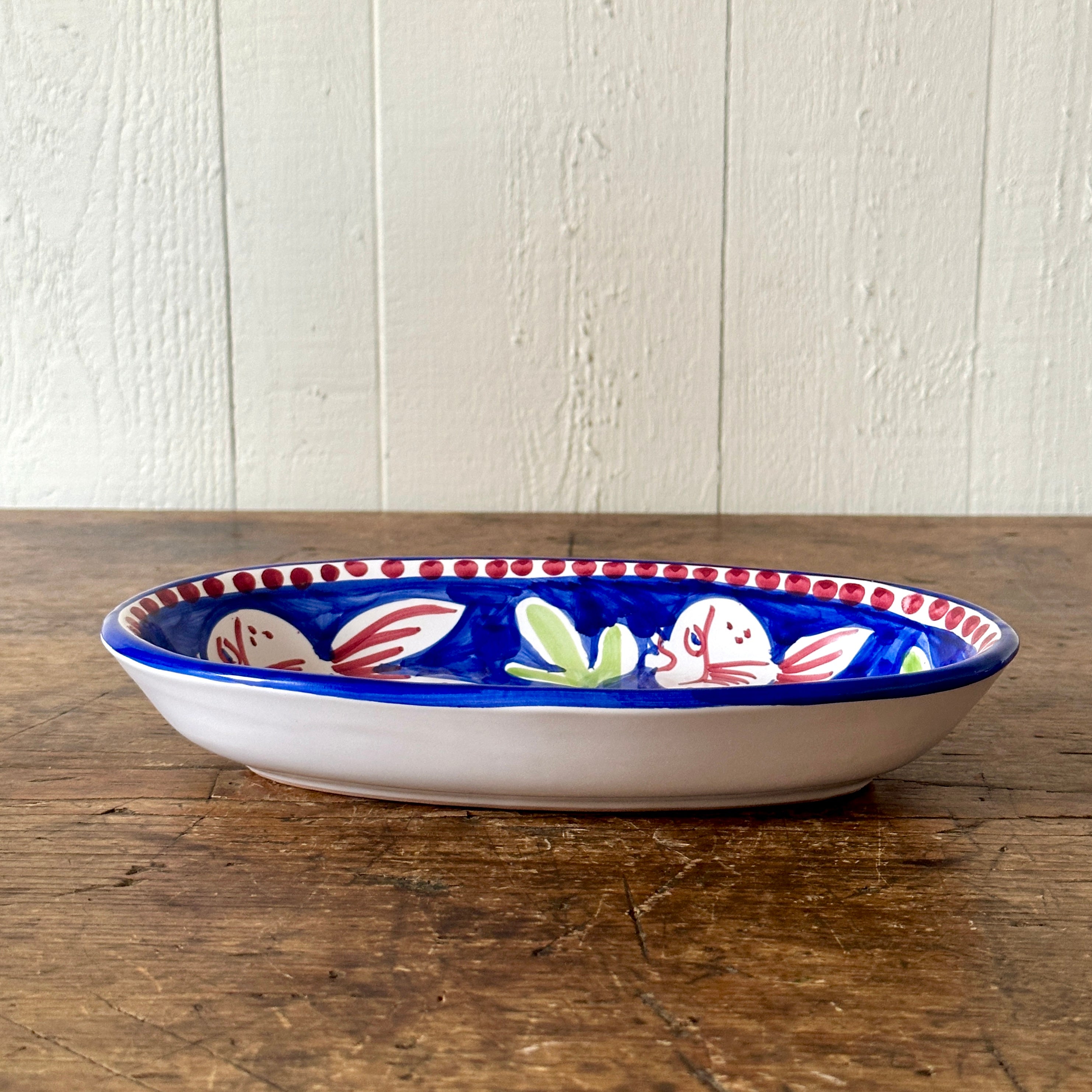 This colorful blue and red Pesce small oval tray features hand-painted fish. Mix and match with other Campagna patterns or with your existing tableware; the combinations are endless!