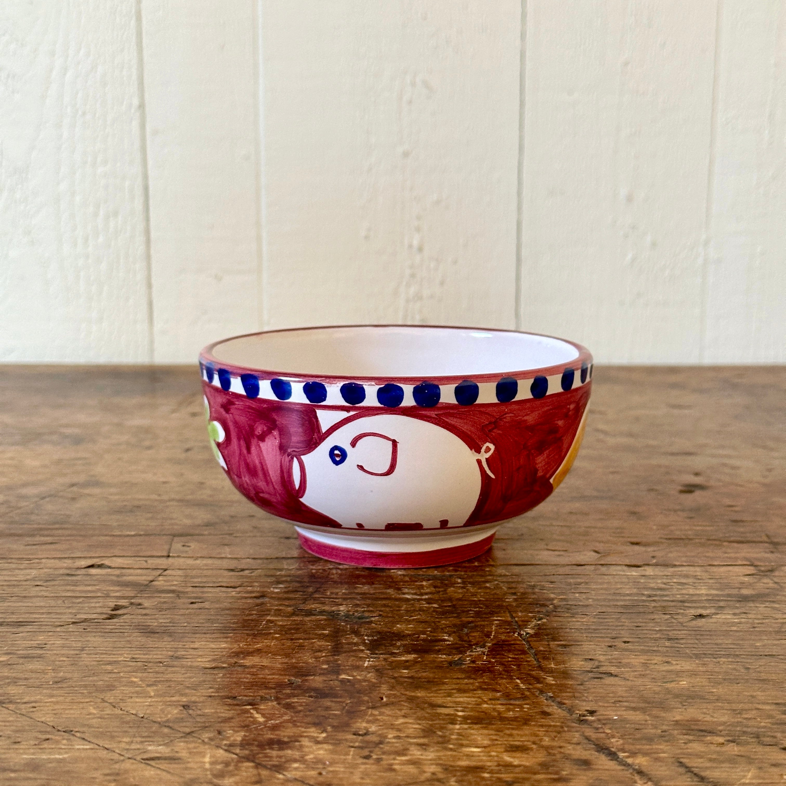 This colorful red and tangerine Porco bowl features hand-painted pigs and carrots. Mix and match with other Campagna patterns or with your existing tableware; the combinations are endless!