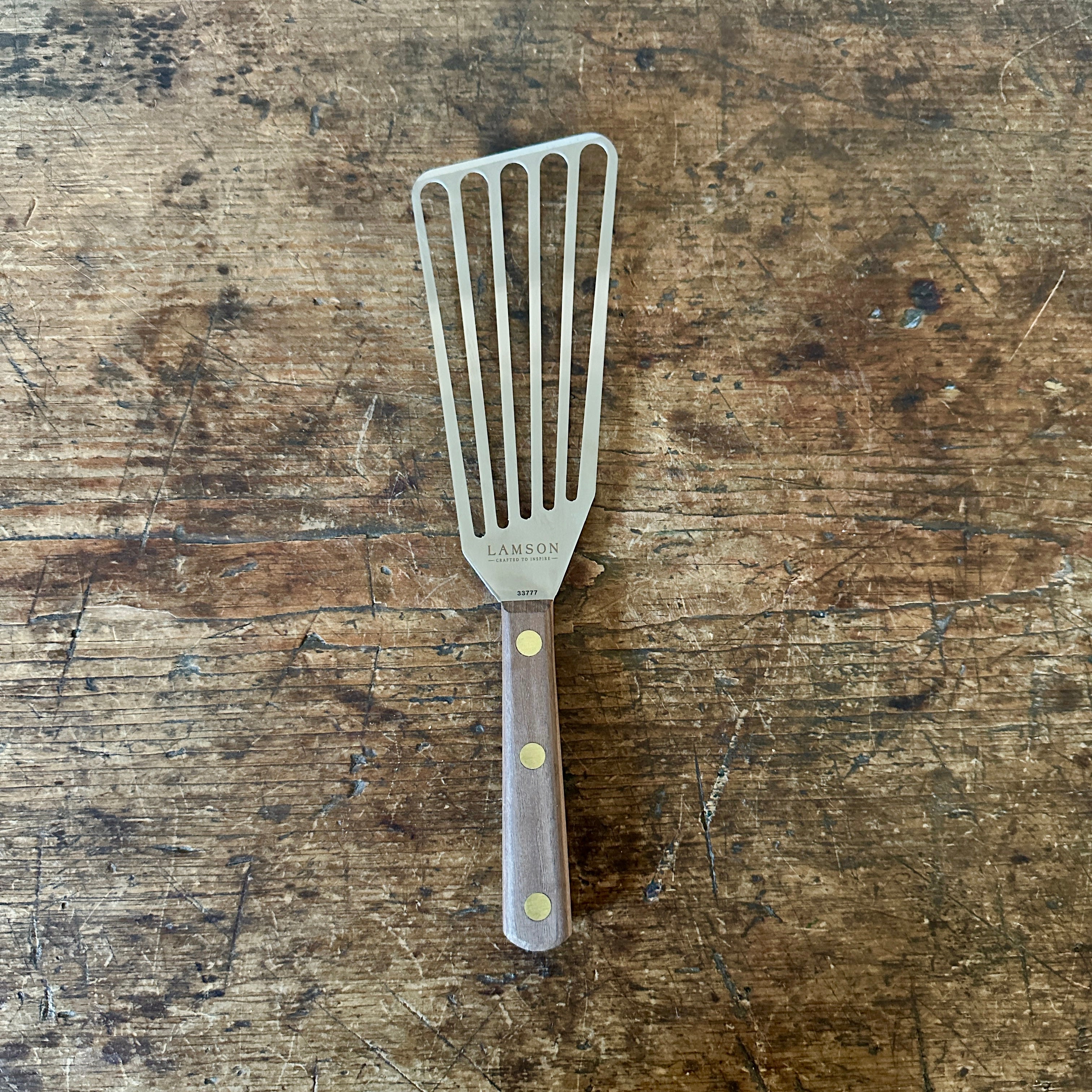 Cooking is a breeze with this razor thin yet surprising strong spatula, with slots that drain cleanly and edges that slide under food like silk.  You can delicately turn paper-thin crepes and confidently lift a hefty burger.