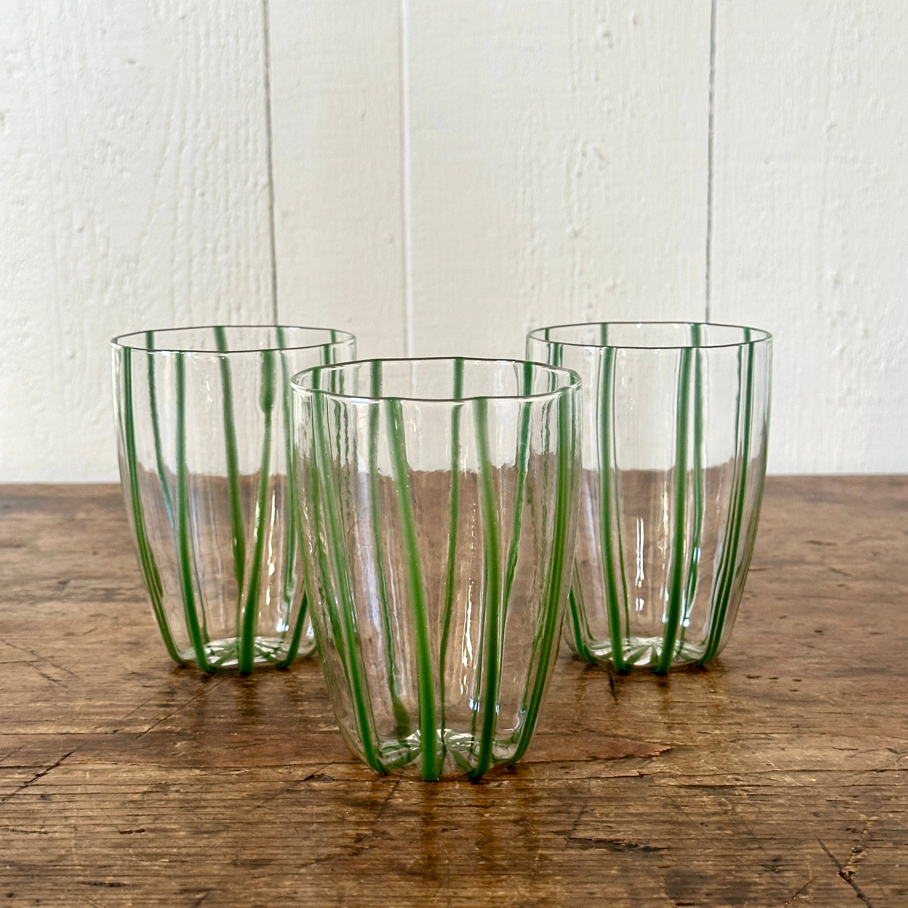 This Italian green stripe tumbler is mouth-blown by skilled artisans and features painterly stripes gliding down each glass. It's a fresh and festive addition to your table!