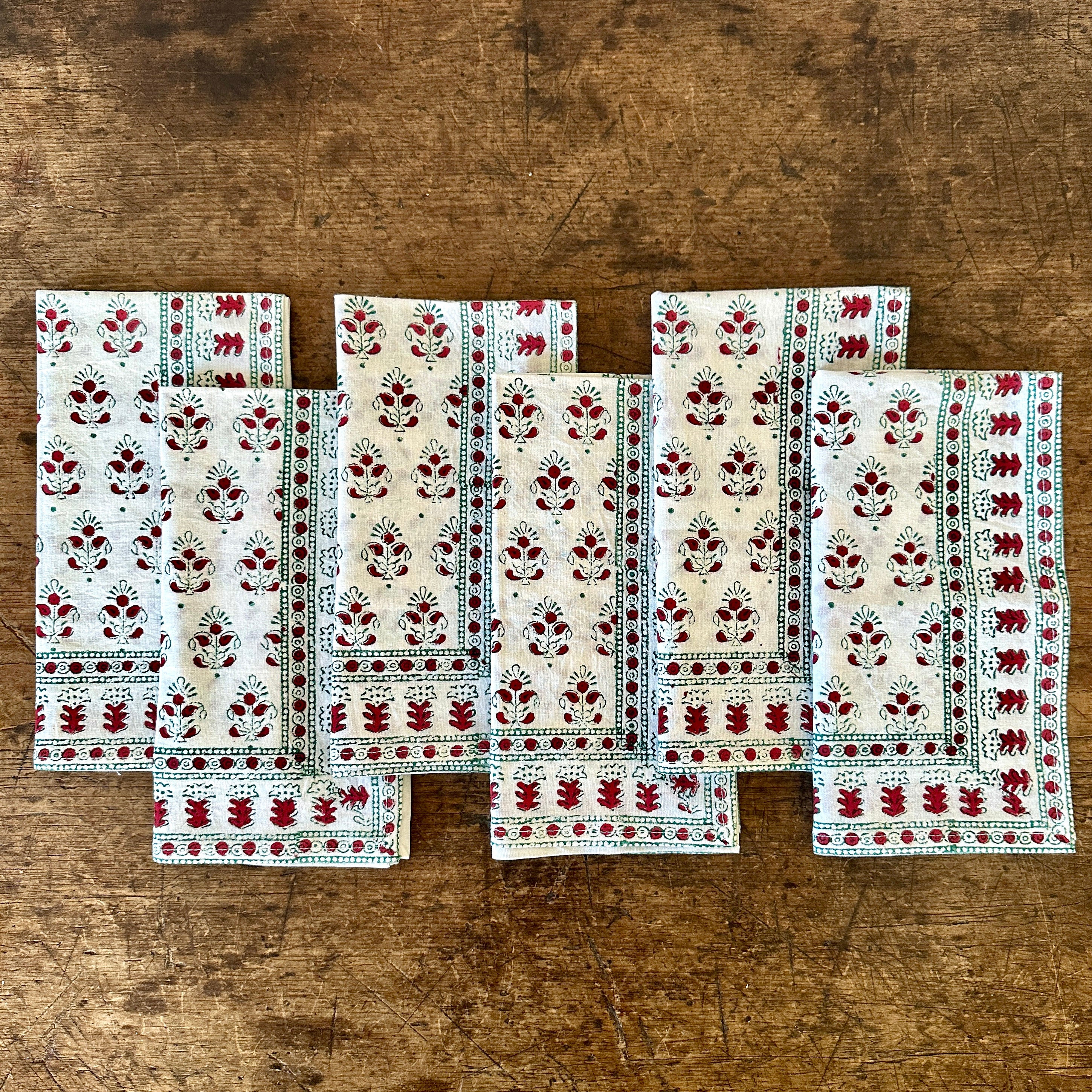 A festive winter green and red print to use on your holiday table. Hand block-printed on cotton fabric in India.