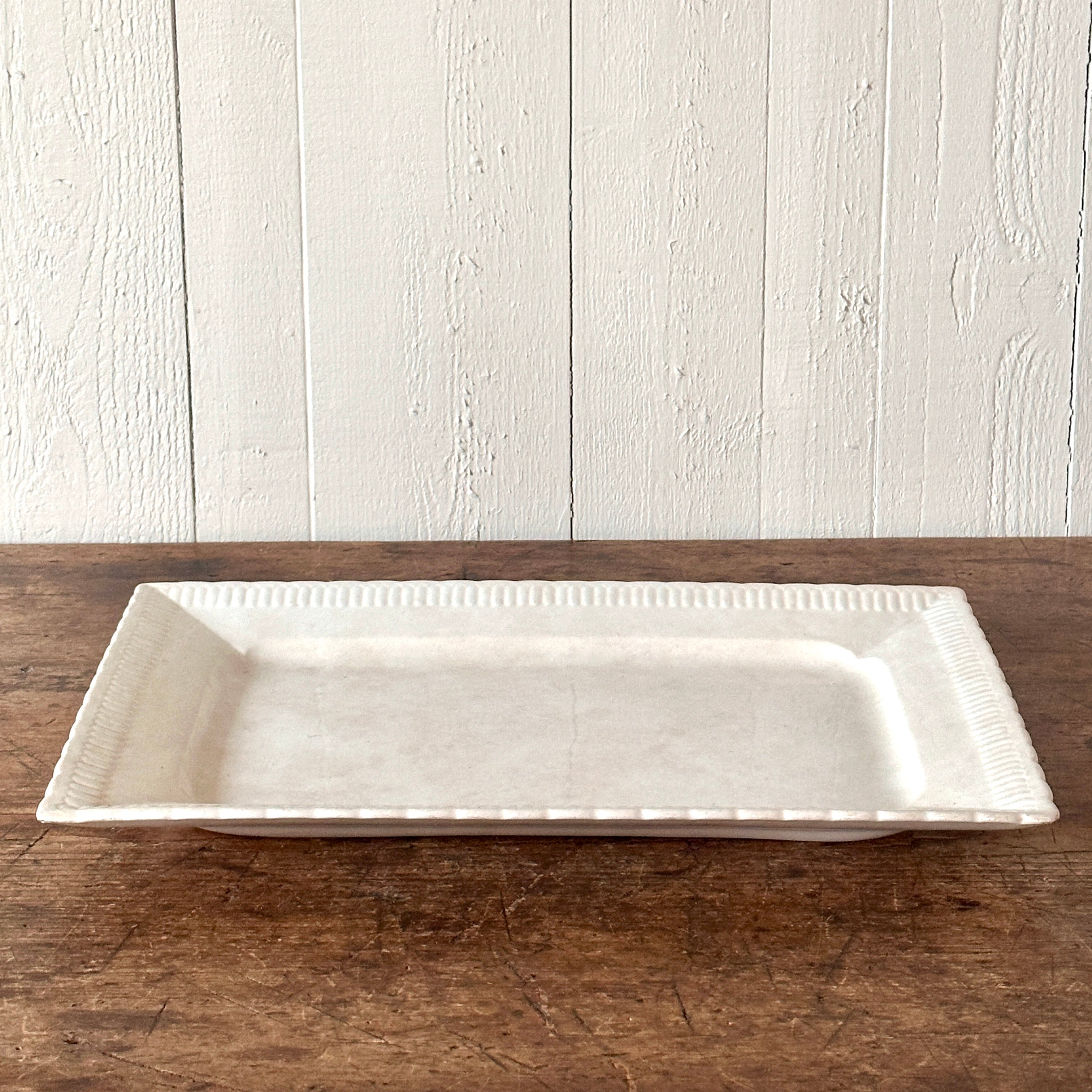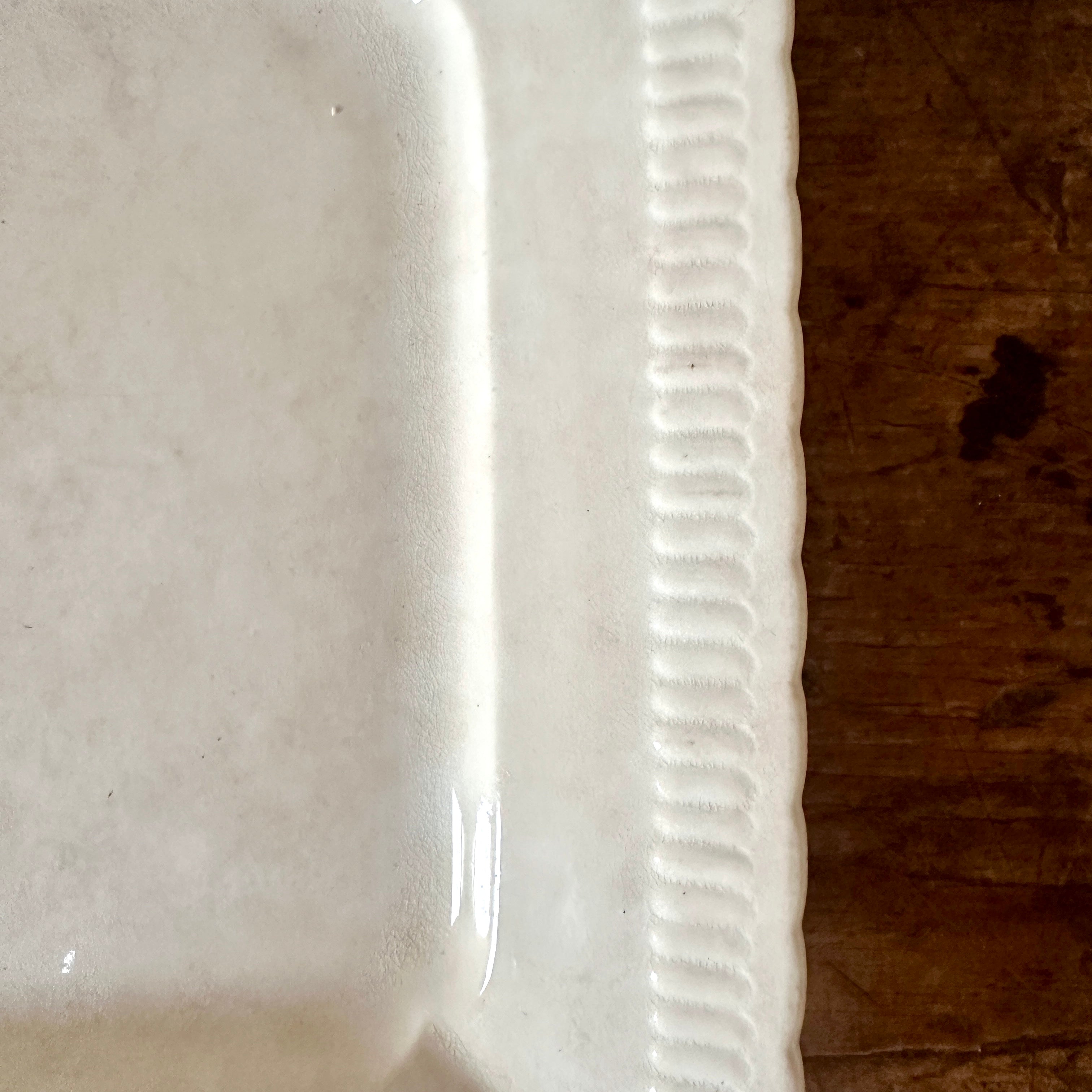 This classic ironstone platter is a useful addition to your serving pieces. Raised detail along border edge, lightly stained. In very good antique condition.