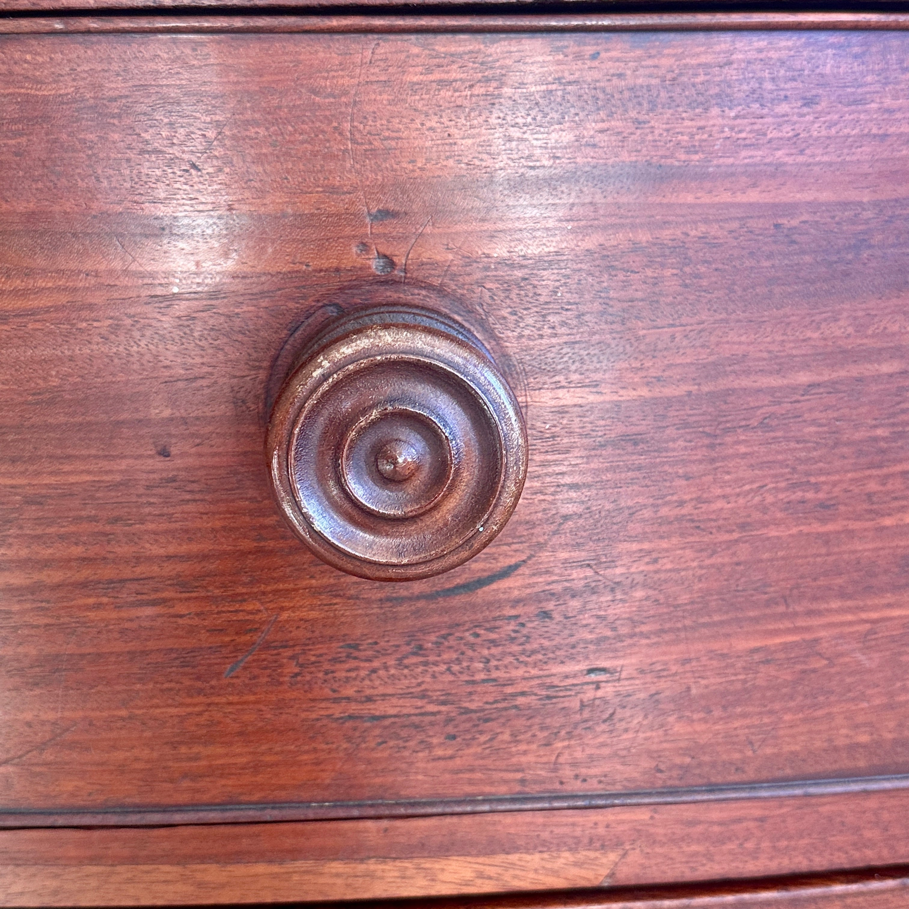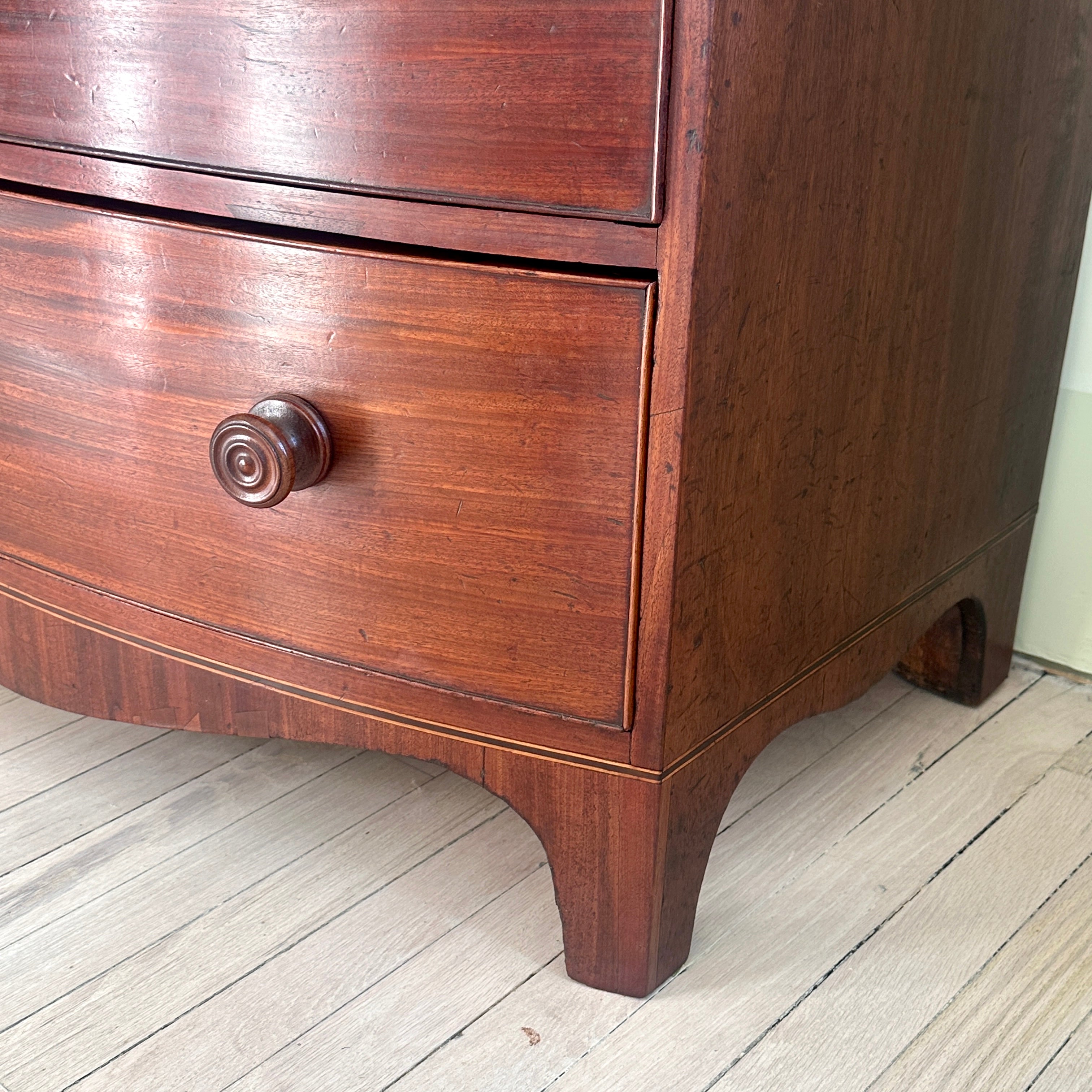 Handsome English 3 drawer bow front chest of drawers with original wood knobs.*