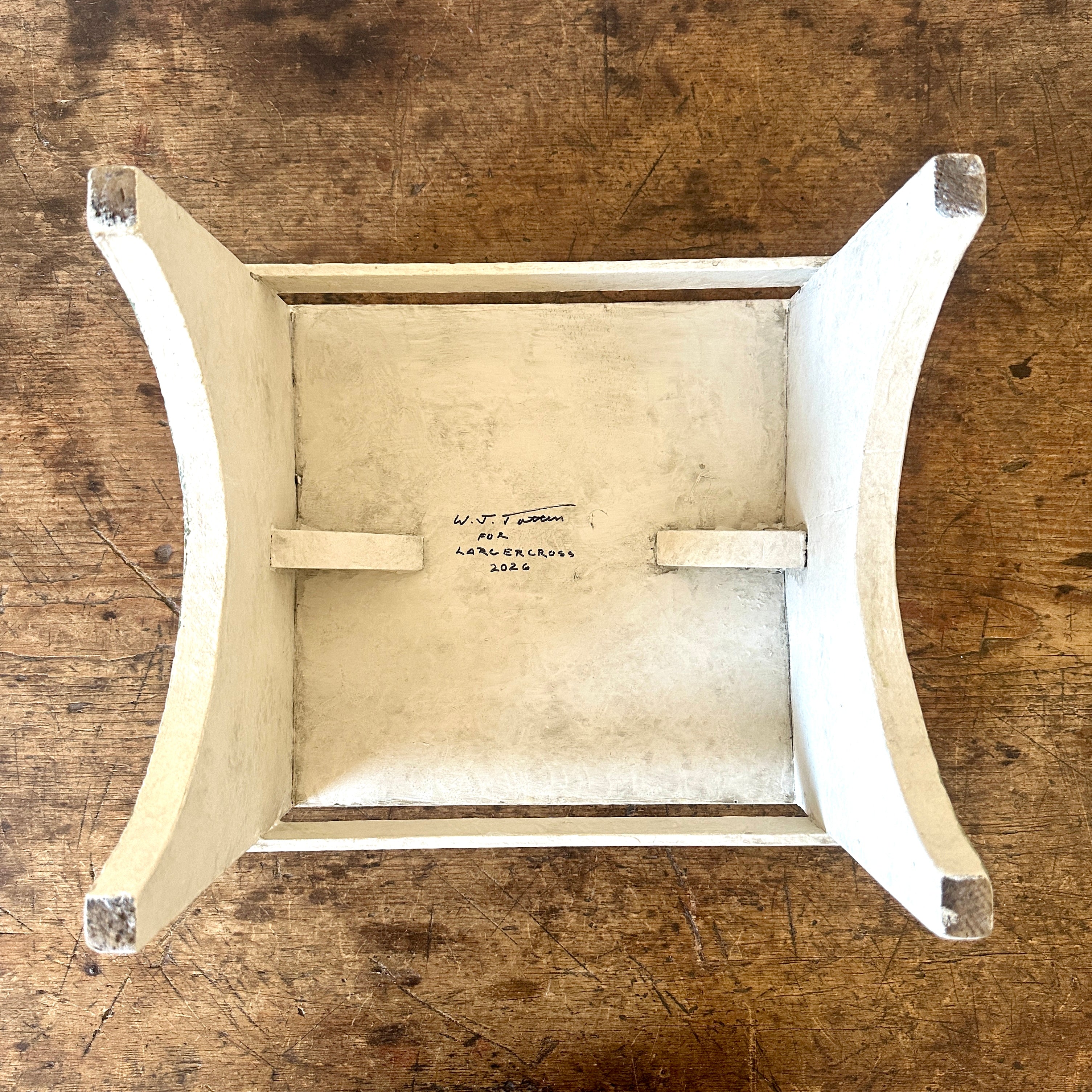 A small, pretty footstool has many uses: the extra boost you need to reach the top shelf in the kitchen, a plant stand, a place to set your drink next to a chair. This vintage stool has been given a refresh by Bill Totten with a coat of off-white paint, pea pod green vine and line, and a touch of antiquing.