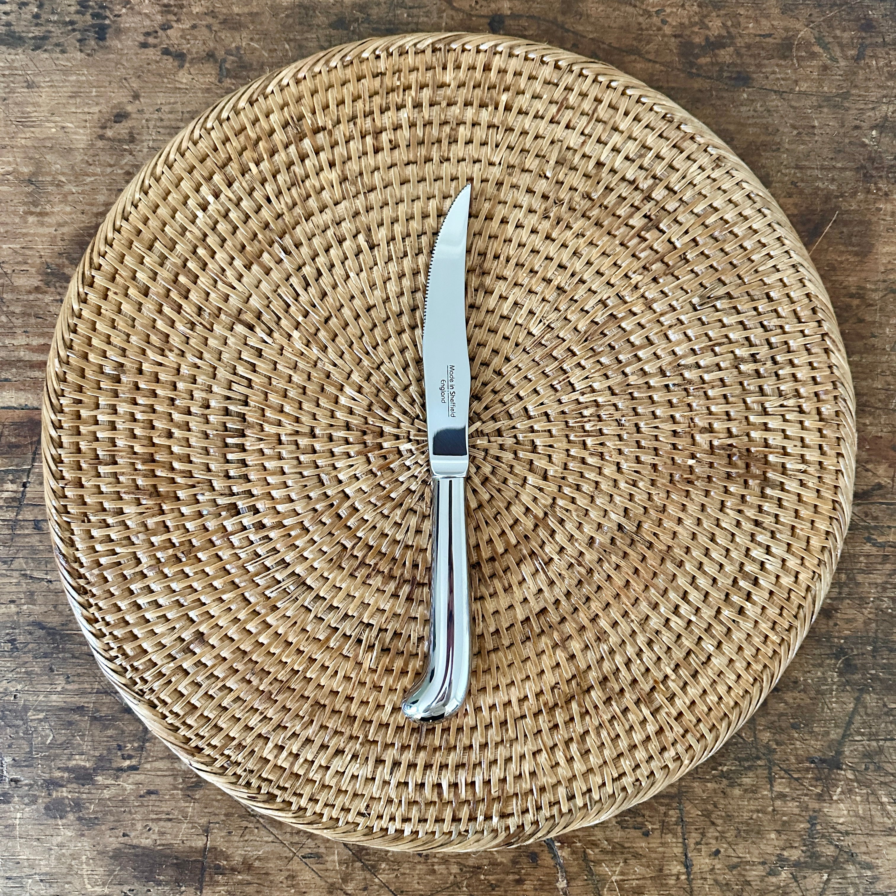 A classic steak knife is always good to have on hand. This one has a traditional pistol handle and hump back blade.