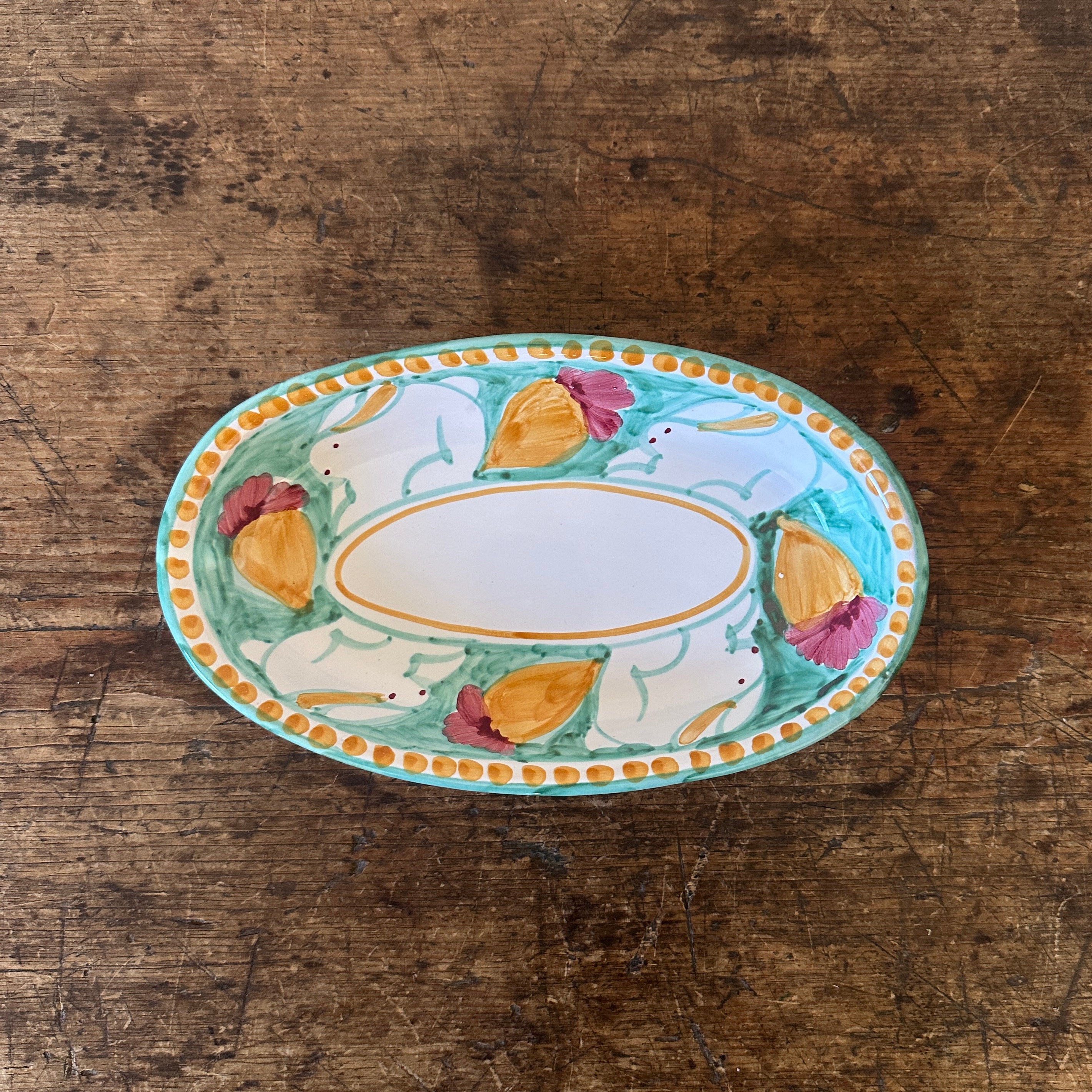 This colorful sky blue and tangerine Coniglio small oval tray features hand-painted rabbits and carrots. Mix and match with other Campagna patterns or with your existing tableware; the combinations are endless!