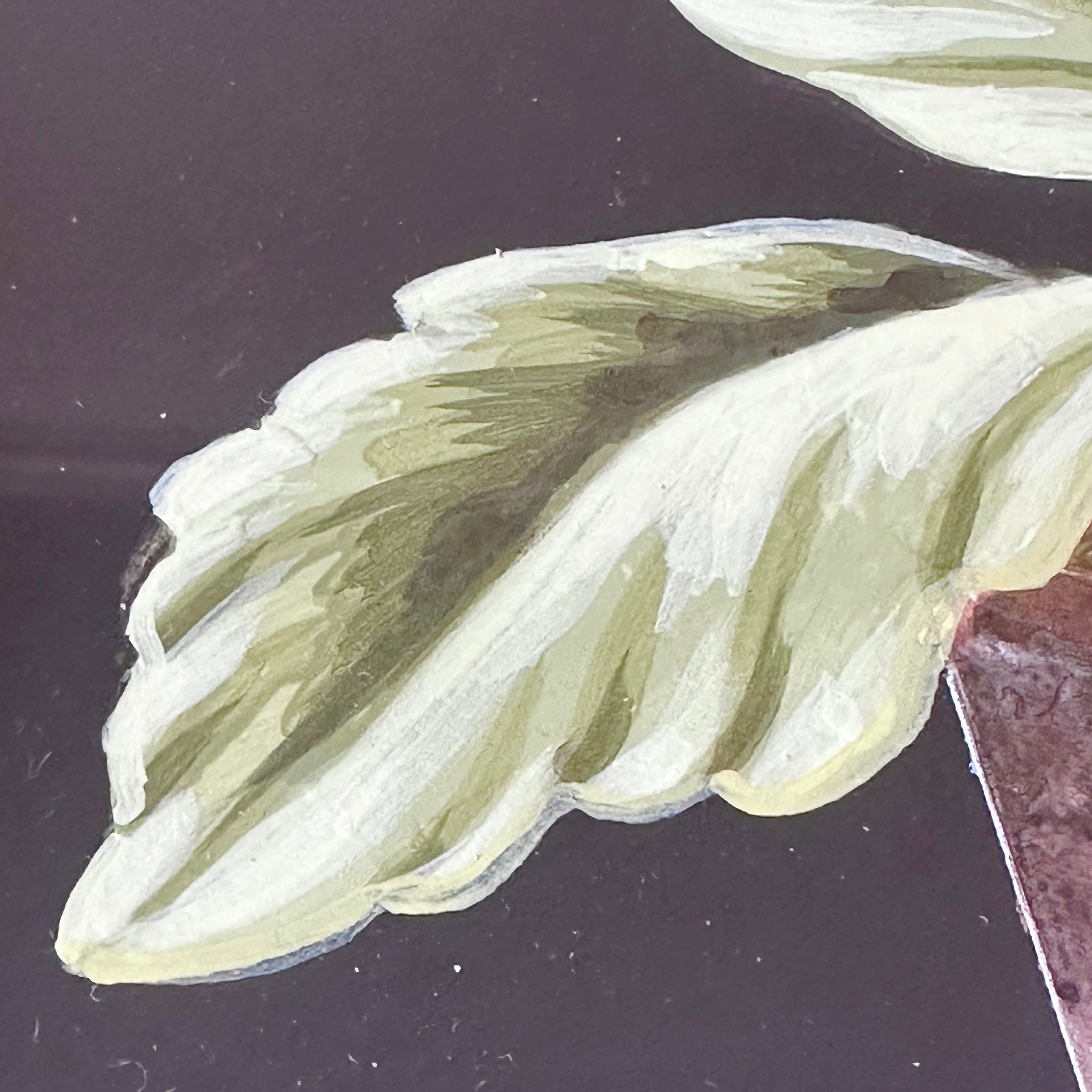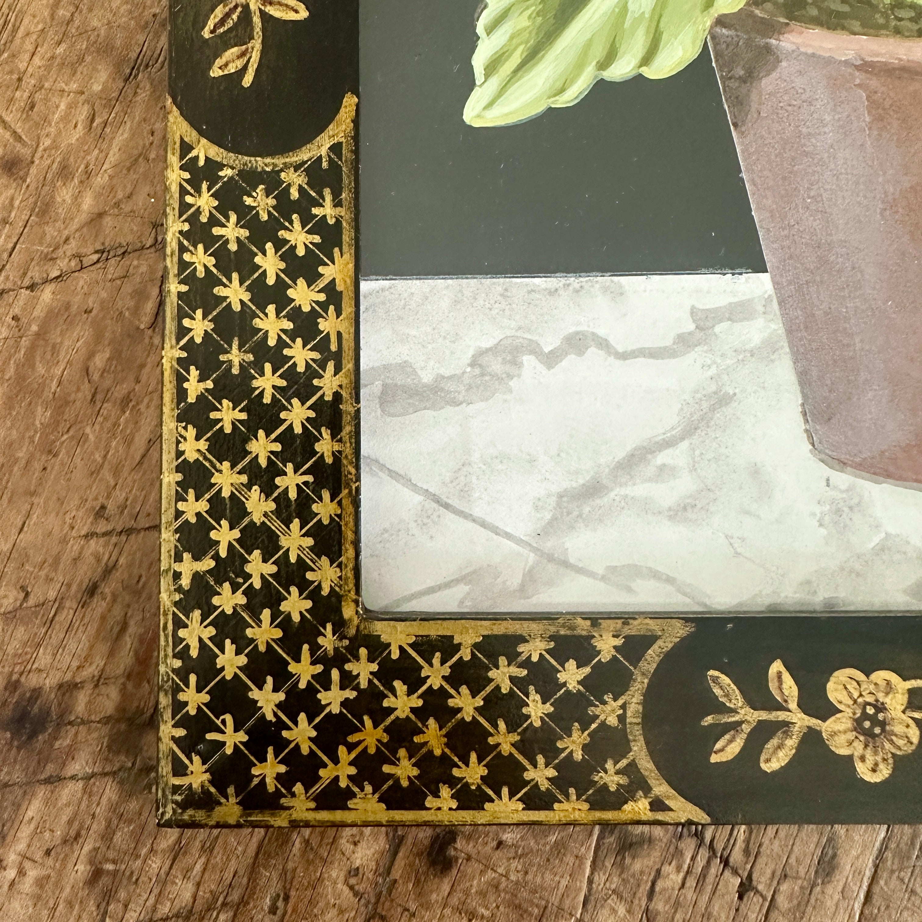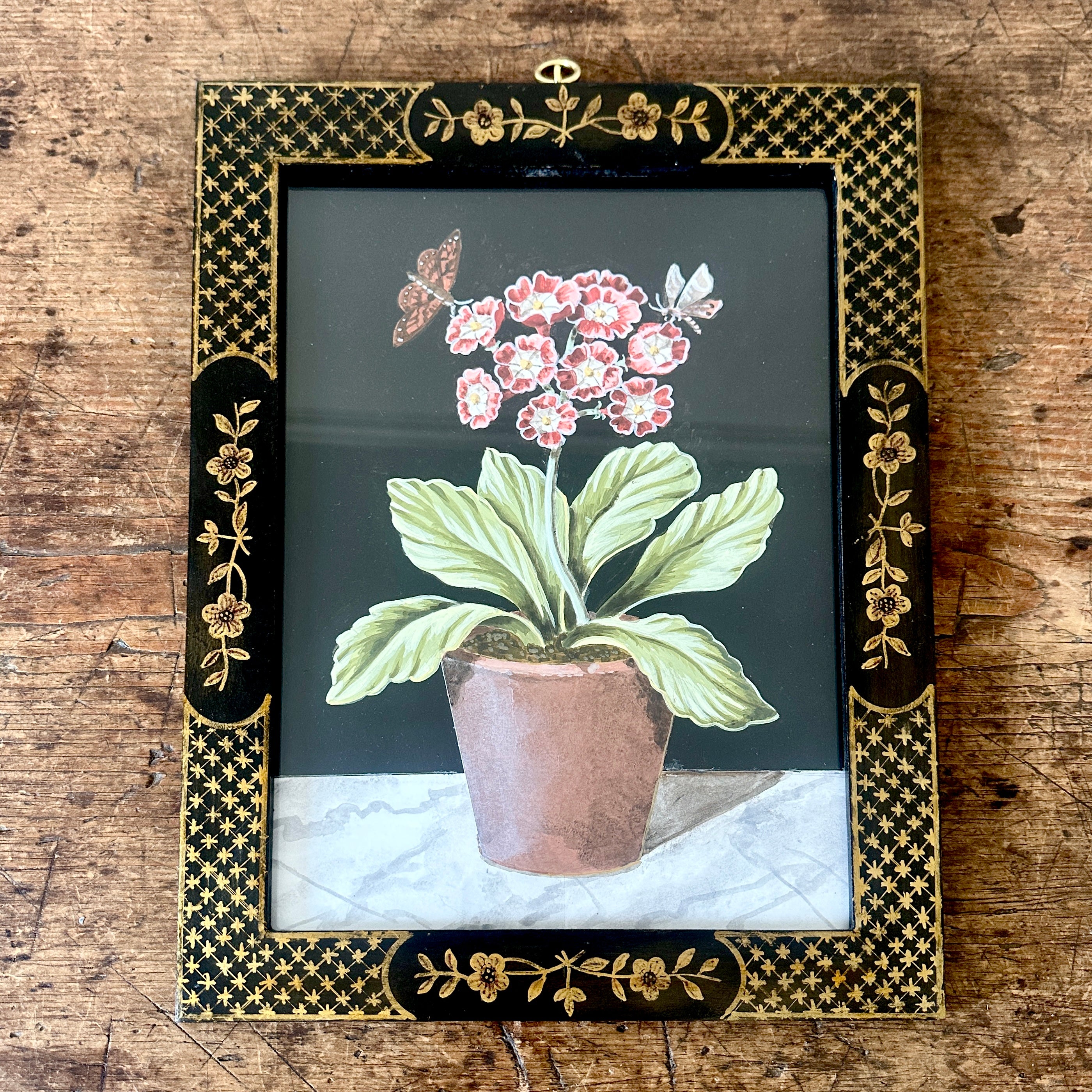 Charming botanical paintings depicting primula auricula and insects. Framed in a bespoke 18th century-inspired black and gilt japanned wooden frames with a Regency-style ring for hanging. Each painting is signed on the reverse by Bill.