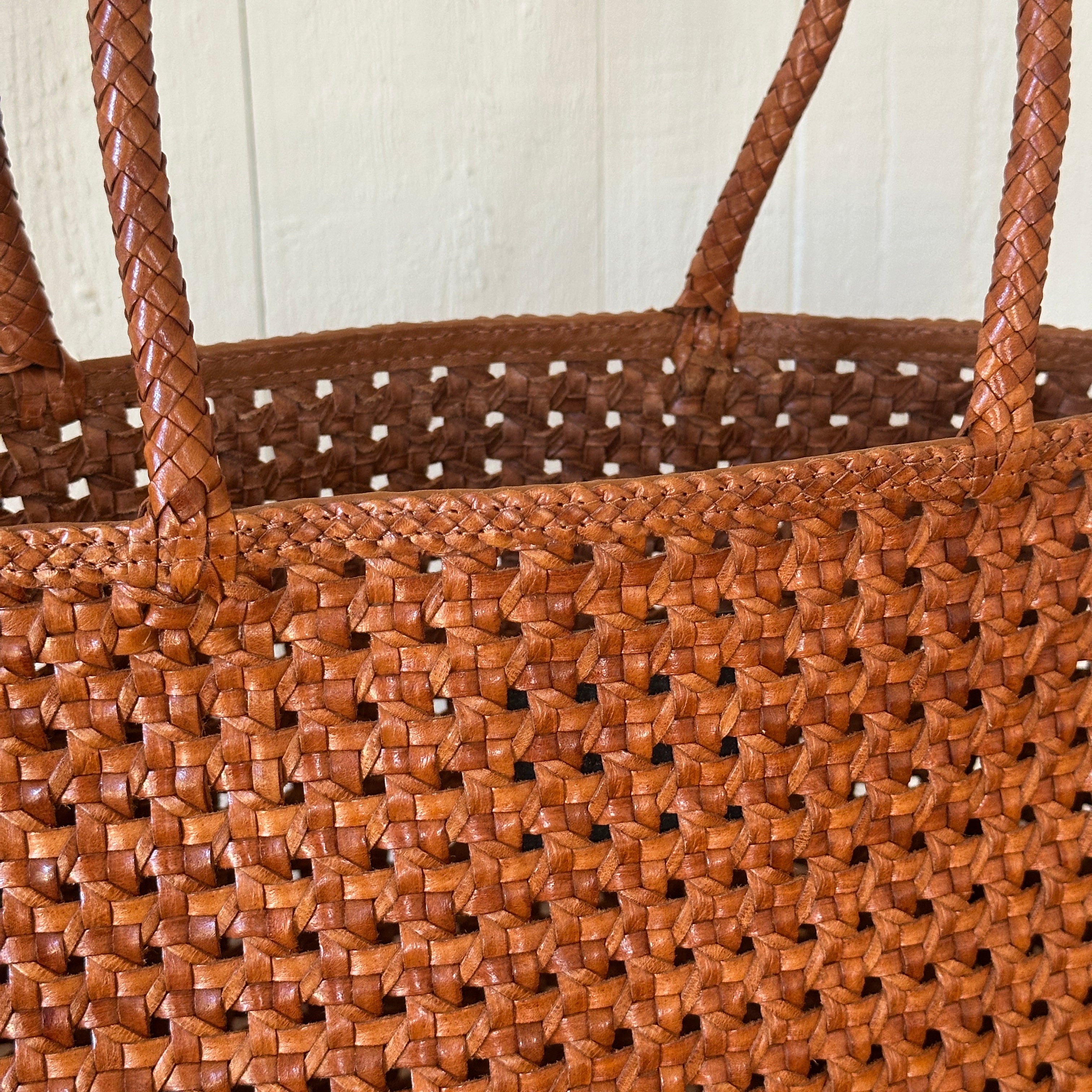 This handwoven tan leather tote is beautiful in its simplicity. Made from buffalo leather, it is durable yet elegant and effortlessly transitions between seasons.