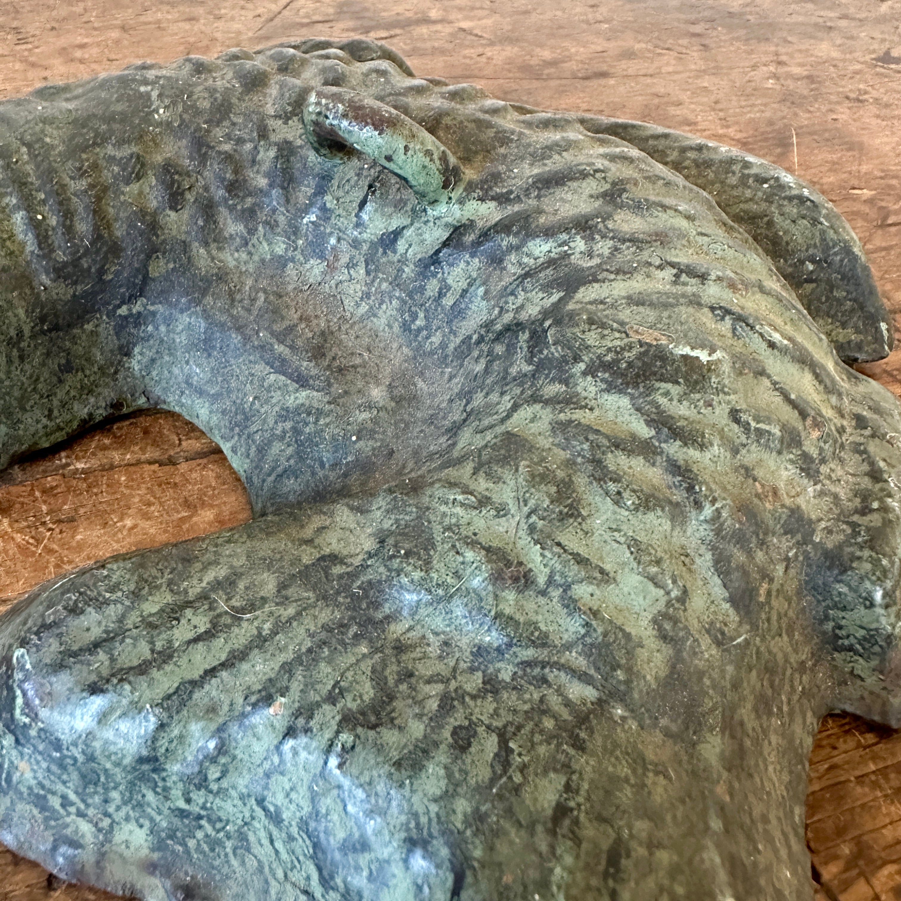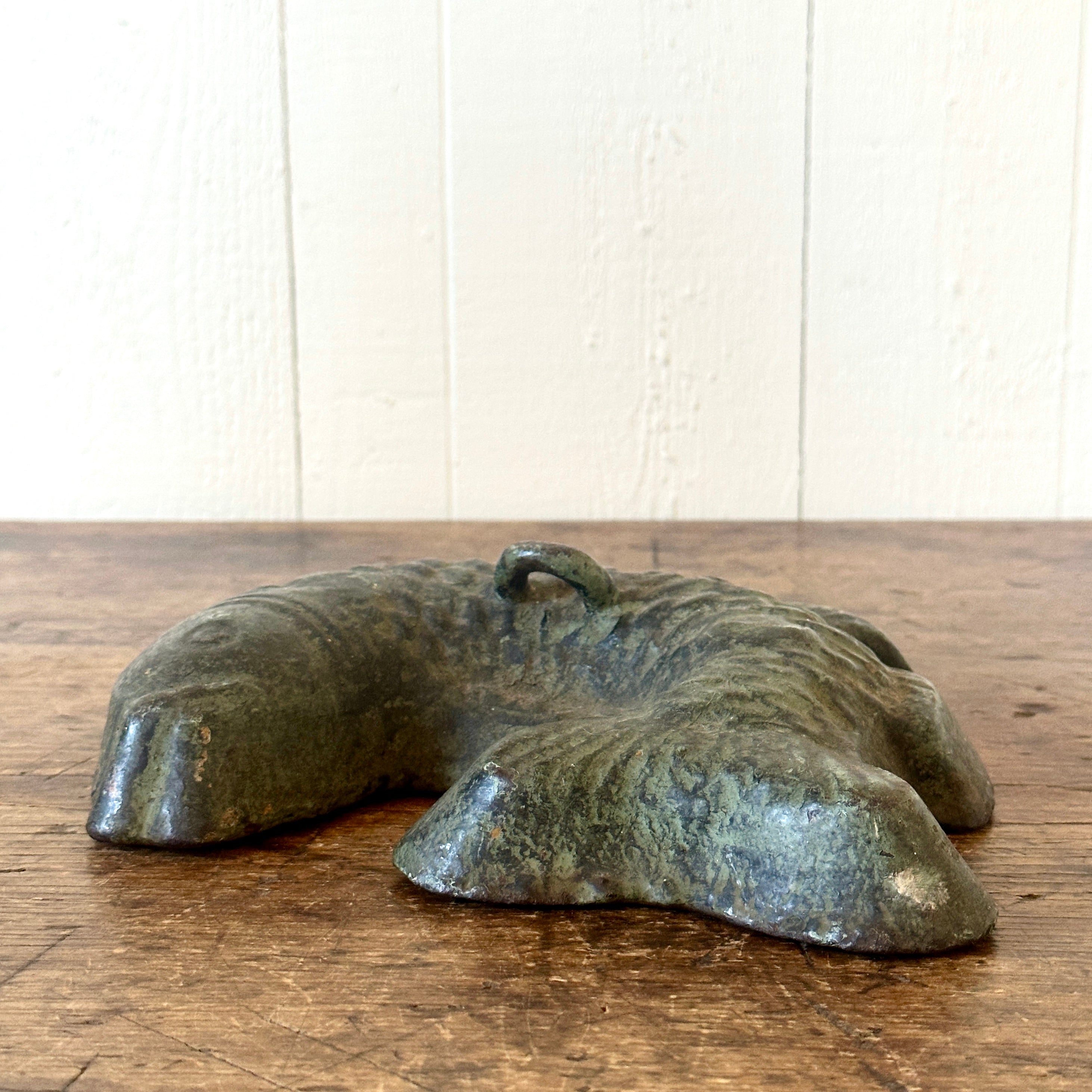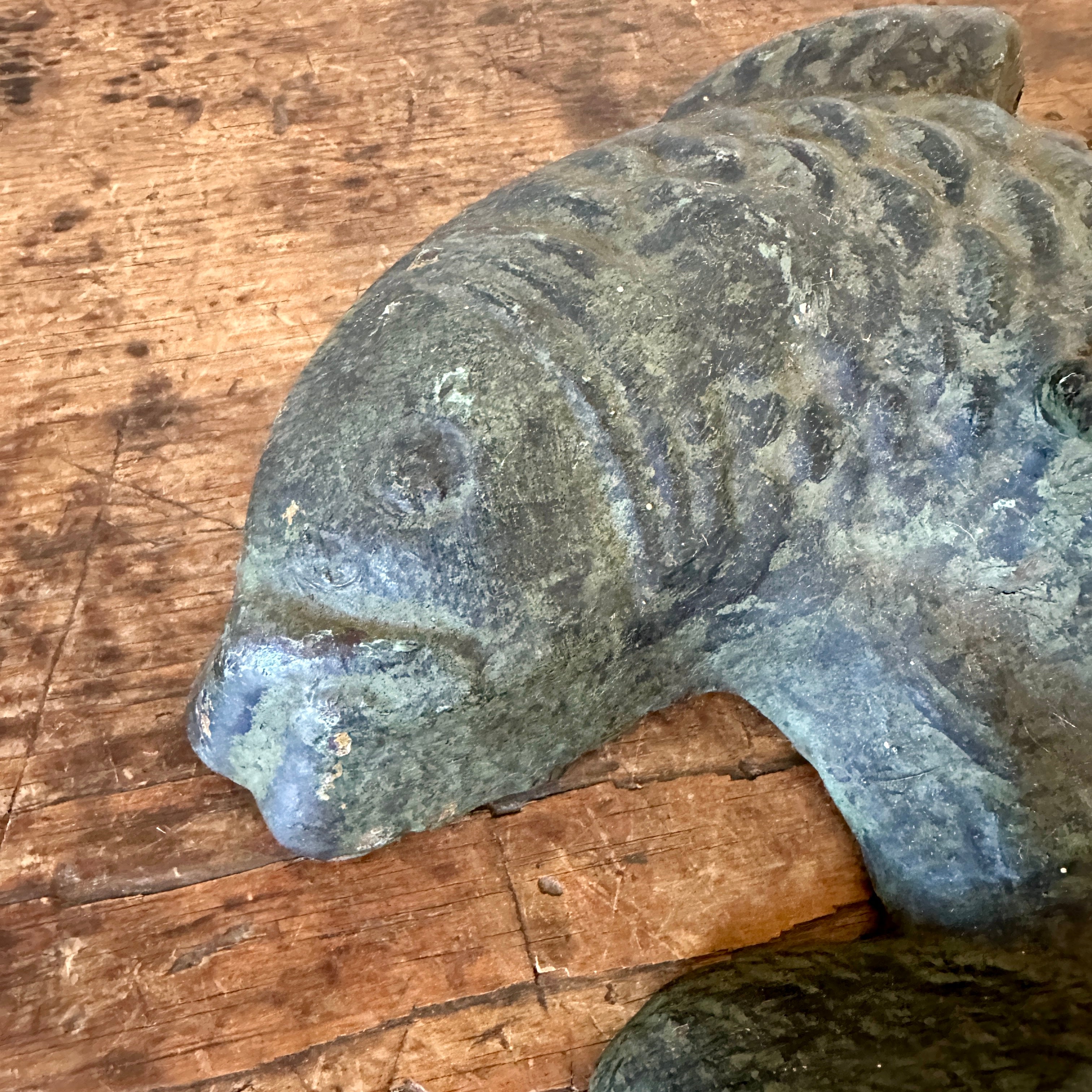 Beautiful 19th century cast iron horse tether in the shape of a fish.  A hint of green paint is visible on the worn, iron surface.  The tether was placed in a buggy and upon arrival, moved to the ground to secure the horse.  Extremely heavy, it makes a fantastic door stop or simply as a piece of decorative Americana for your home.