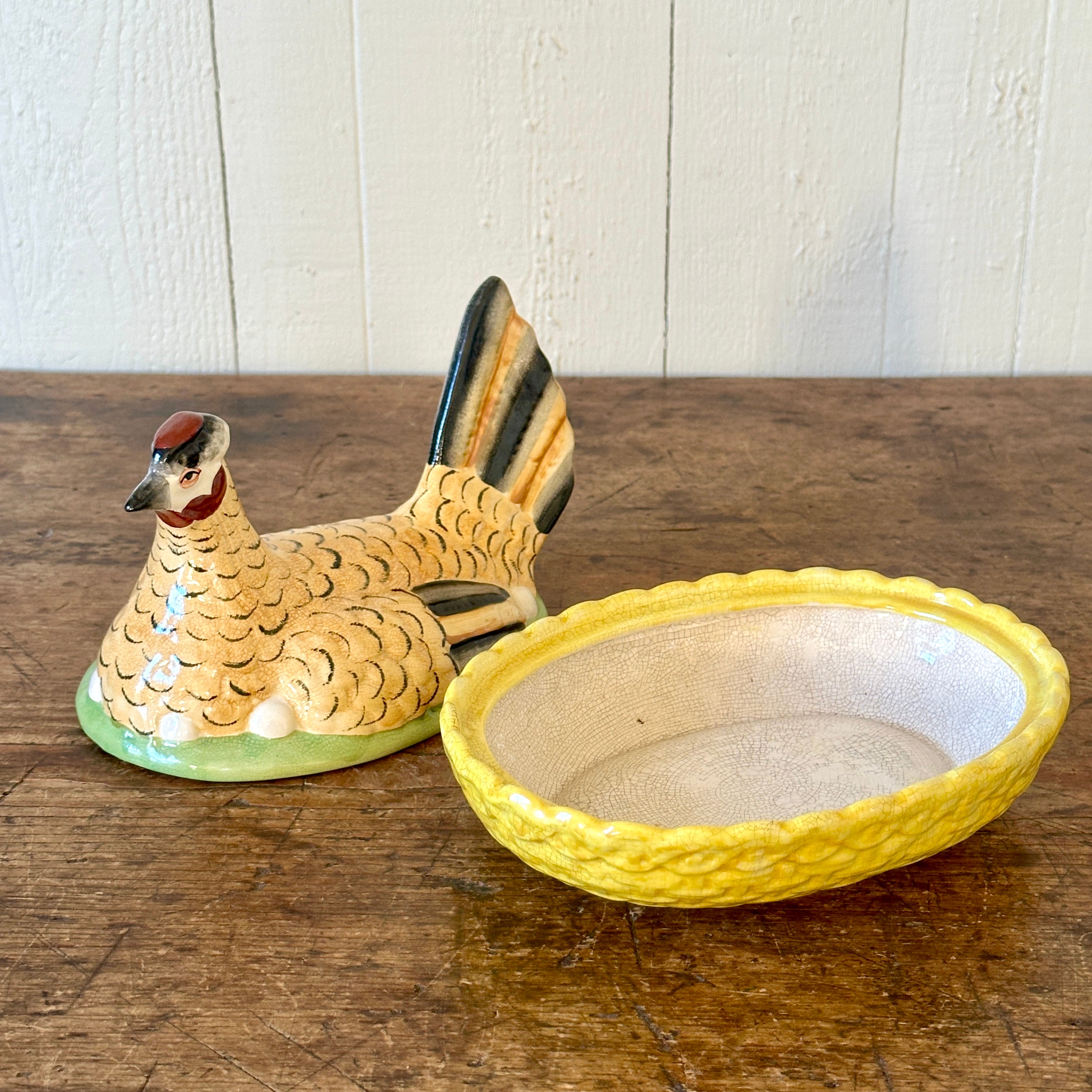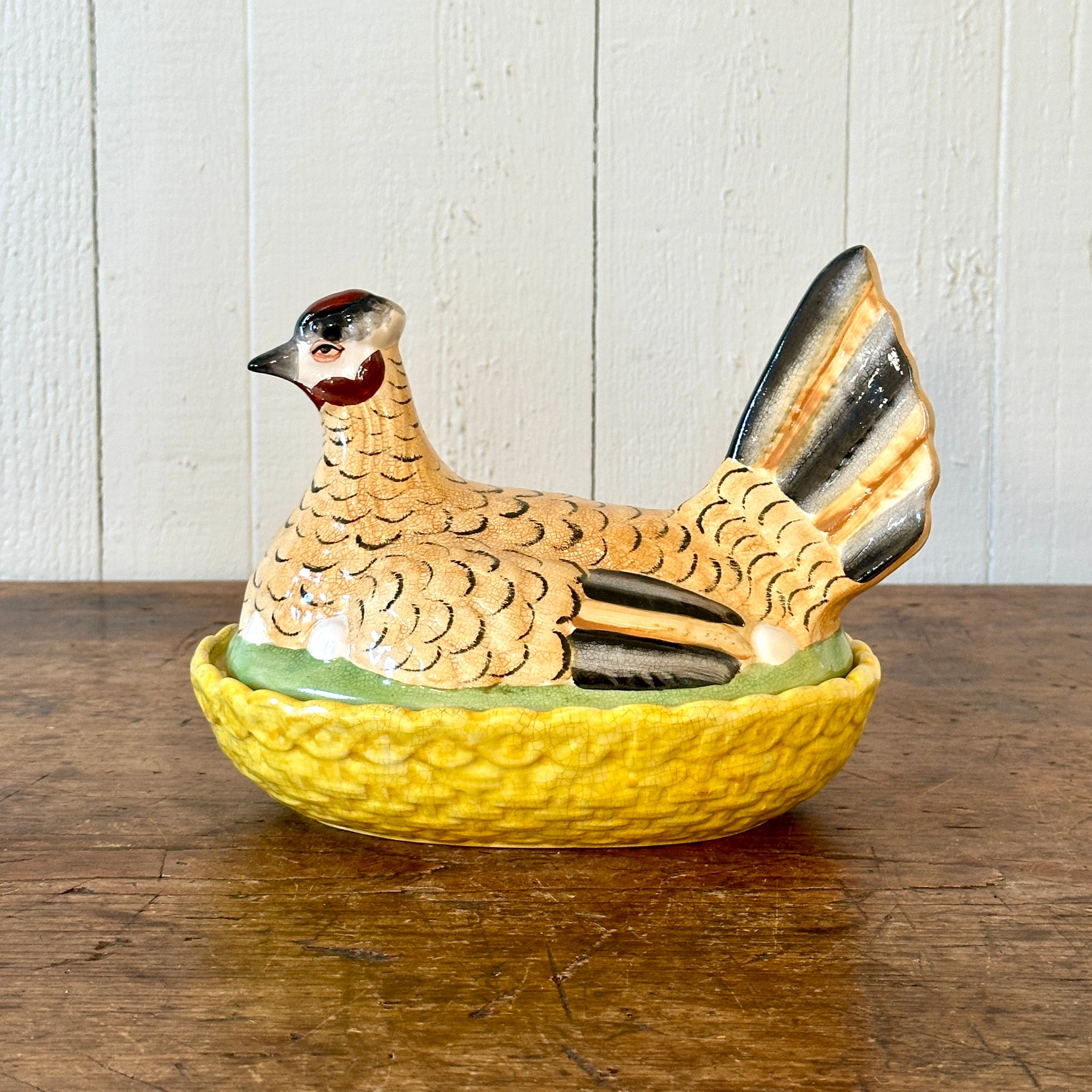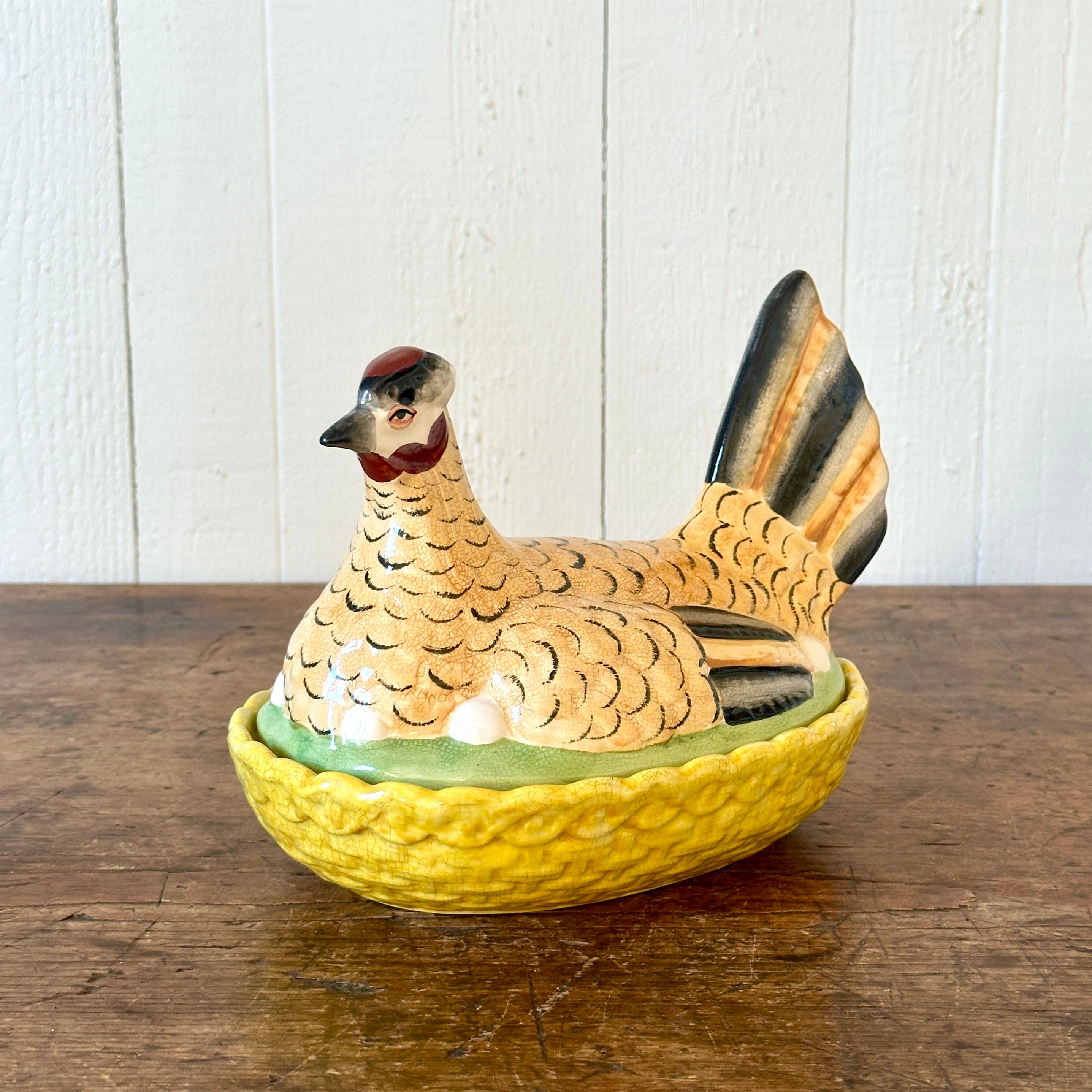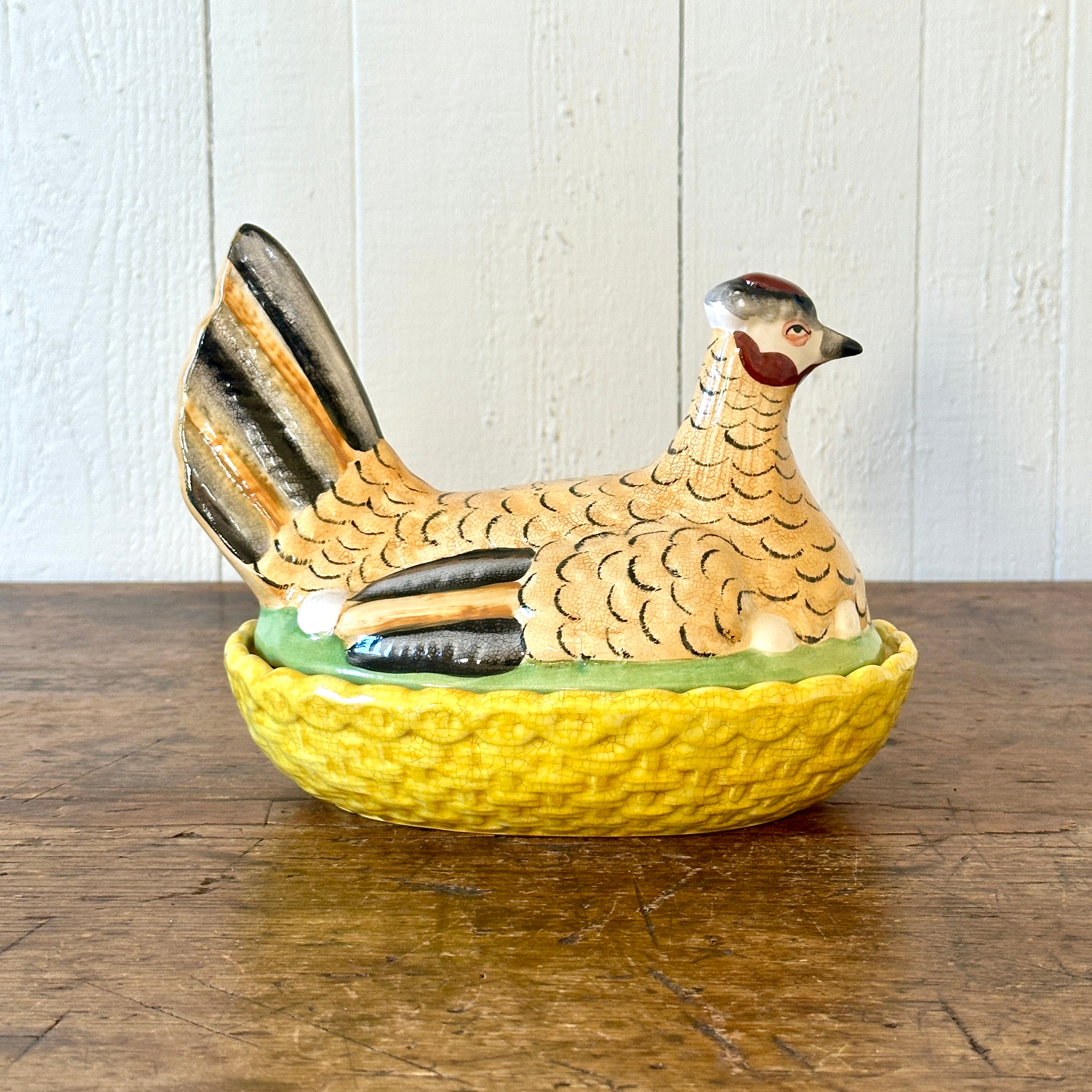 Charming and colorful, this 19th century Hen on Nest was typically used for storing eggs. Displayed on a shelf or used in your tablescape, it's a classic country piece.