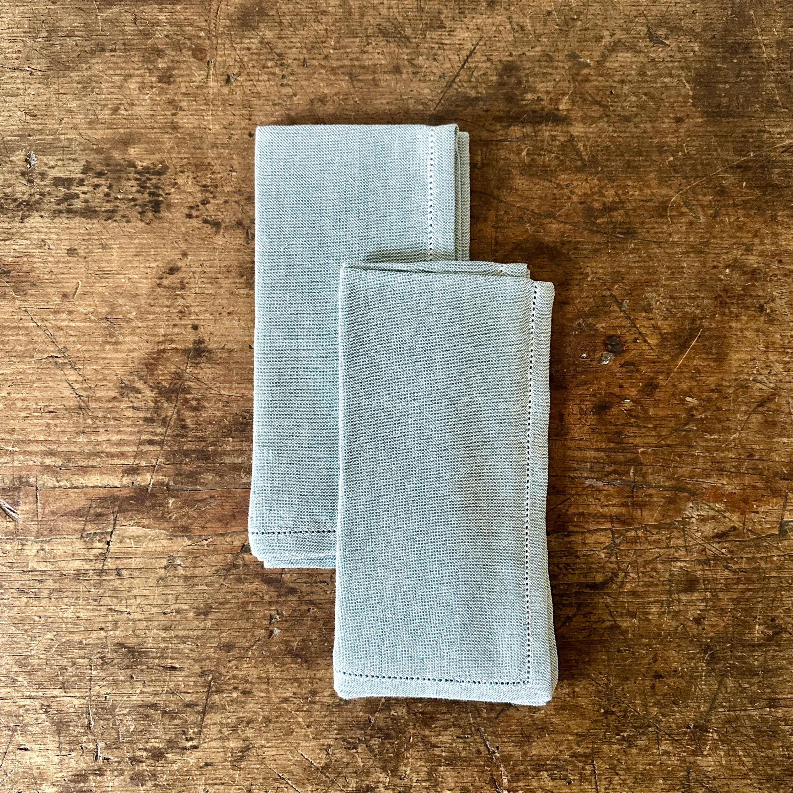 A pair of classic hemstitch napkins in Sky Blue.