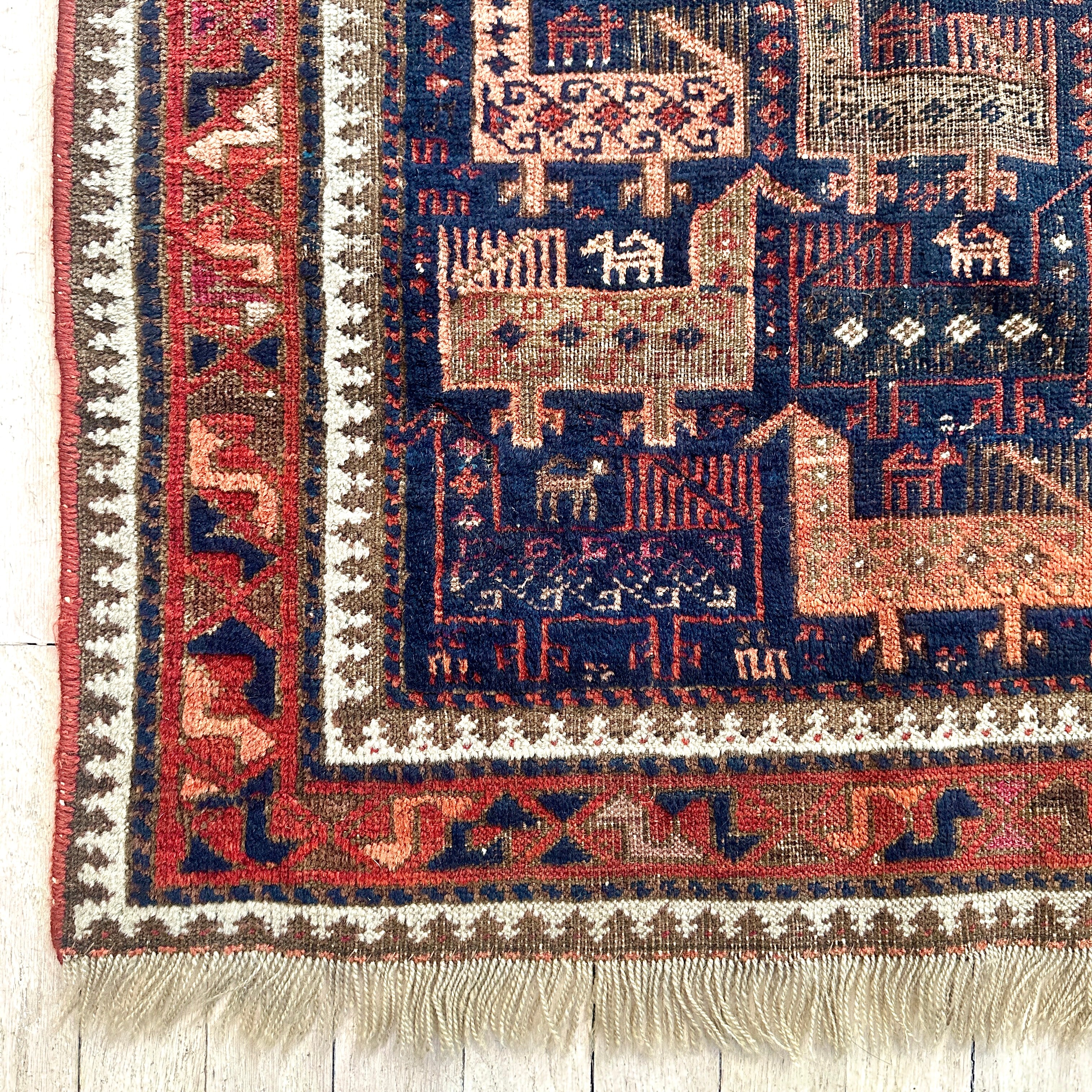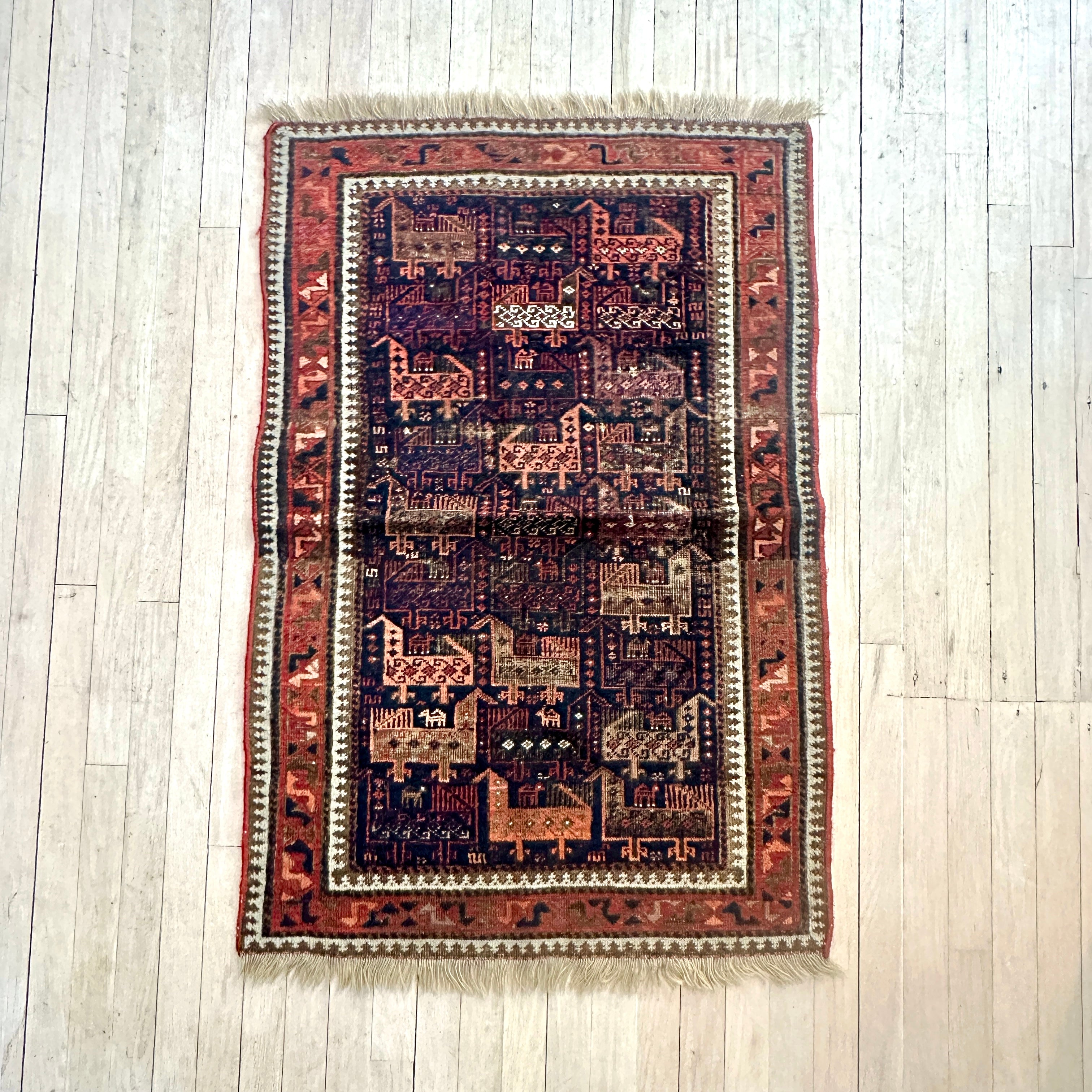 Small wool rug in rich tones of taupe, rust, blue and brown with 1.5" fringe.